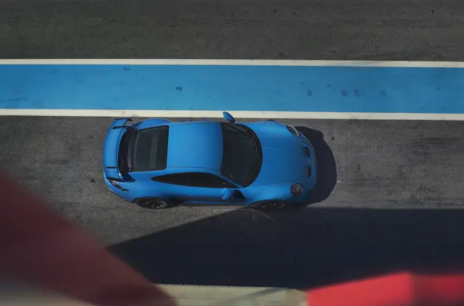De geavanceerde aerodynamica profiteert van de ervaring die Porsche Motorsport heeft opgedaan op het circuit. Zonder noemenswaardige gevolgen voor de luchtweerstandscoëfficiënt bouwt de GT3 meer downforce op. Wanneer de handmatig verstelbare achterspoiler in de performance-positie staat, genereert hij samen met de diffuser een duidelijk hogere neerwaartse druk. Daardoor ‘plakt’ de auto in snelle bochten op het circuit nog beter aan het asfalt. De voorwielophanging met dubbele driehoekige draagarmen is direct afgeleid van de succesvolle 911 RSR GT-racer.